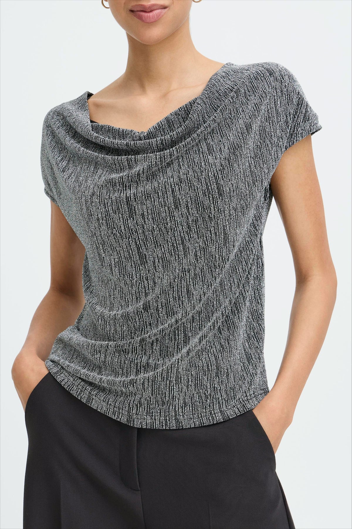 The b.young BYSHILOH blouse combines contemporary elegance with eye-catching sparkle. This collarless design features a refined melange fabric with a smooth finish, while delicate glittery accents add subtle luminosity. The straight-cut silhouette offers a flattering, versatile fit, and the quilted hem provides structured definition. Perfect for elevating casual wear or creating polished layered looks, this silver sparkle blouse transitions effortlessly from day to evening occasions.